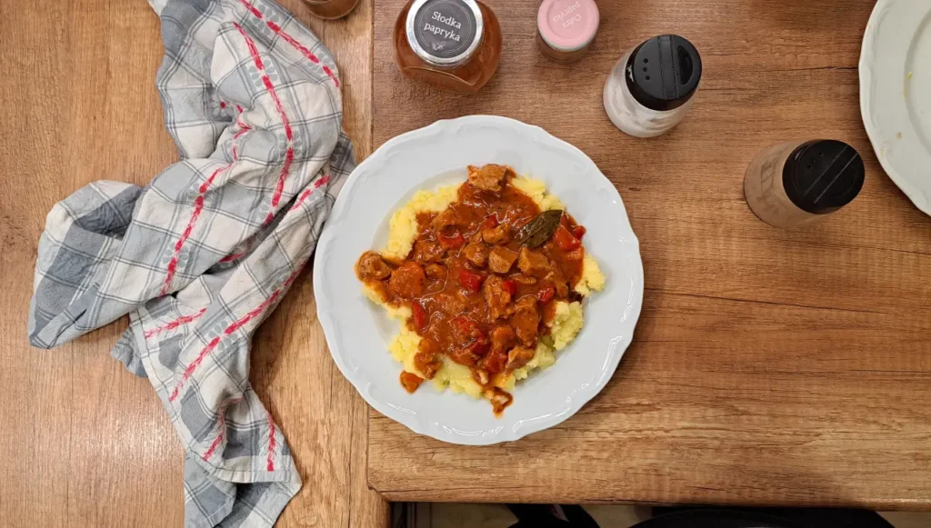 To gulasz węgierski z czerwoną papryką, na bazie szynki wieprzowej. Do placków ziemniaczanych, jak i ziemniaków czy kaszy. Klasyk w uproszczonej wersji.